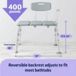EASY ADJUSTABLE HEIGHT SETTINGS AND REVERSIBLE BACKREST – Easy push-button design for simple, custom seat height adjustment from 17.5-22”. Reversible backrest fits on either side of seat to accommodate any shower or tub.