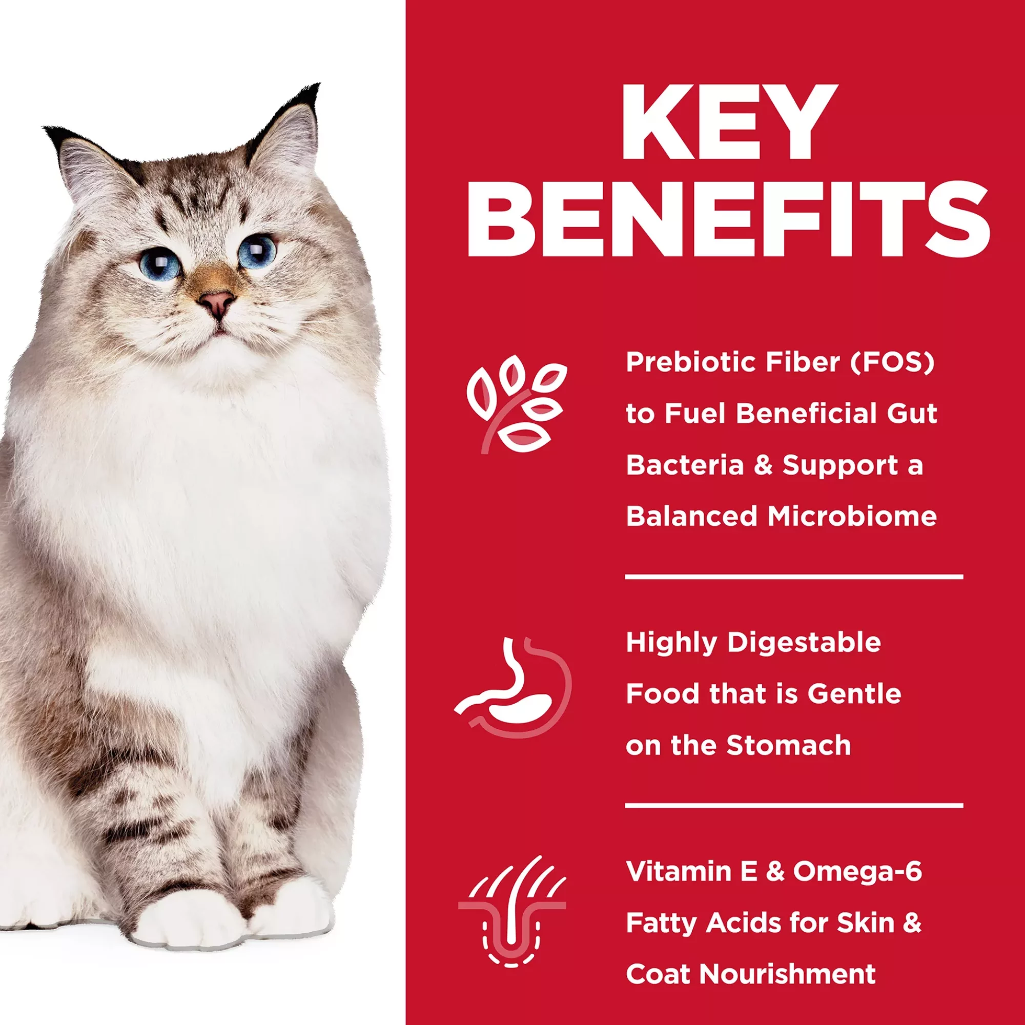 Support your cat’s sensitive stomach and promote a soft, shiny coat with this sensitive stomach and skin dry cat food. Formulated with a unique blend of prebiotic fiber (FOS), vitamin E, and omega-6 fatty acids, this gentle recipe helps maintain a healthy gut microbiome, improve digestion, and nourish the skin and fur from within.