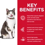This indoor senior cat food helps older cats stay healthy, active, and comfortable. Its balanced formula supports energy levels, promotes heart and kidney function, and maintains joint flexibility. Added taurine enhances eye health, while vitamin E and omega fatty acids nourish the skin and coat. Natural fiber supports digestive health and reduces stool odor, making it perfect for indoor cats. Made with natural ingredients and no artificial colors or preservatives, this formula provides complete nutrition for long-term vitality