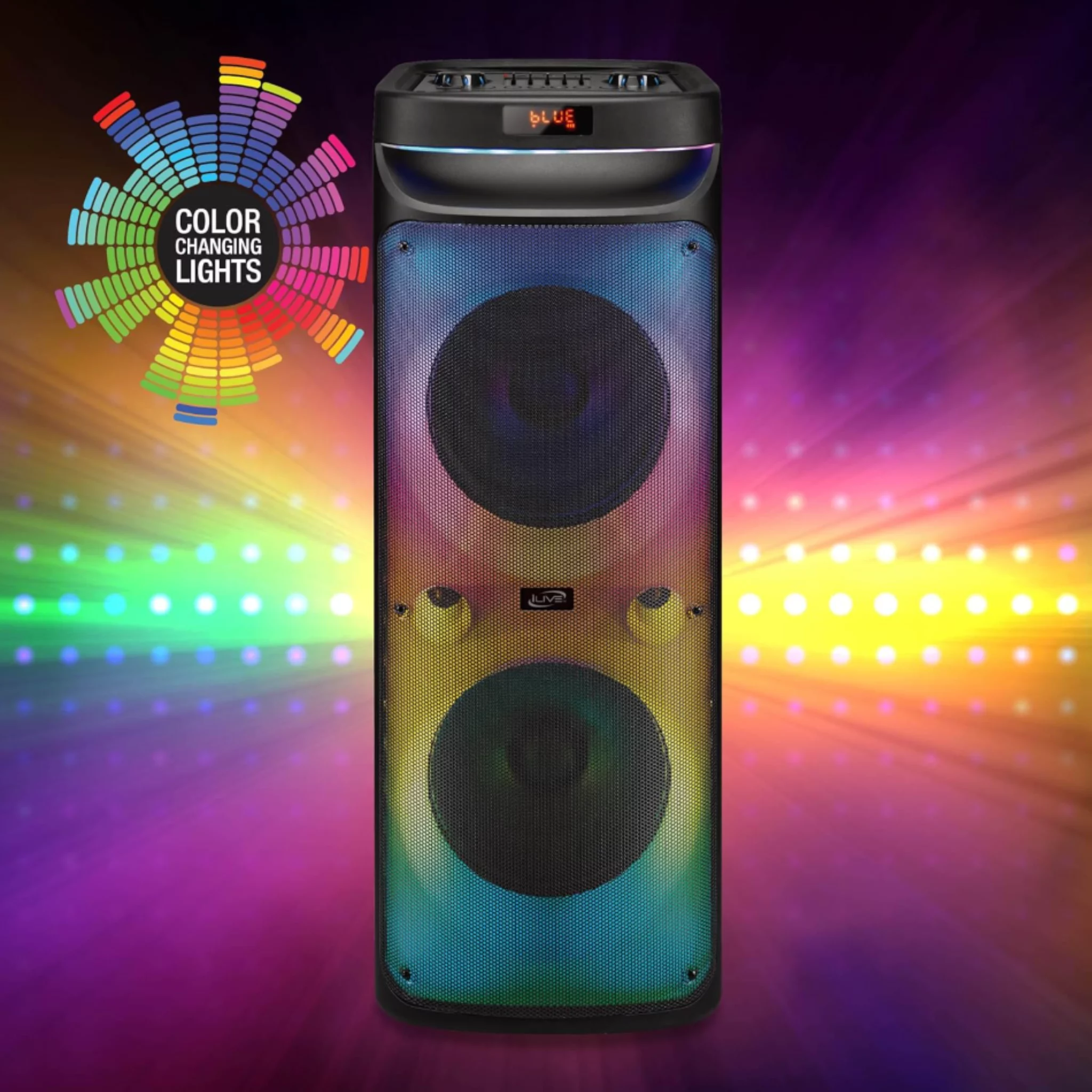 iLive Electronics LightShow+ Wireless Speaker System ISB653B Bluetooth Party Speaker with Color Changing Lights 40W Output Dual 10 Inch Speakers Microphone Support Karaoke Portable Audio System