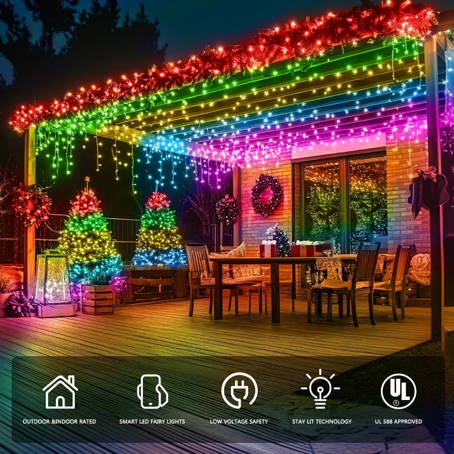 Smart RGB Christmas Tree Lights: This 66ft long clear wire Christmas lights set features 200 vibrant high-brightness RGB LEDs that create a festive atmosphere. The flexible wire can be easily shaped and wrapped around Christmas trees, windows and doors, trees, railings, and other places.
