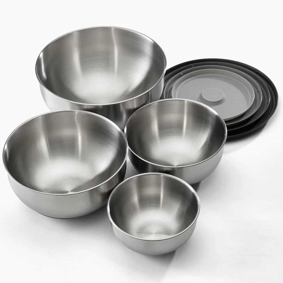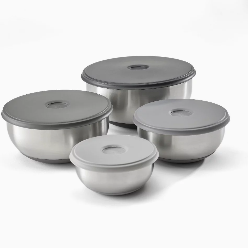 • Four generous sizes with matching lids provide versatility for everything from mixing batters and marinating meats to storing leftovers