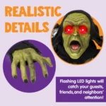 Scary Halloween decoration: our zombie groundbreaker decoration consists of a green zombie head and 2 arms covered with clothes, it’s time to surprise trick-or-treaters with the zombie groundbreaker with spooky sounds and flashing eyes.