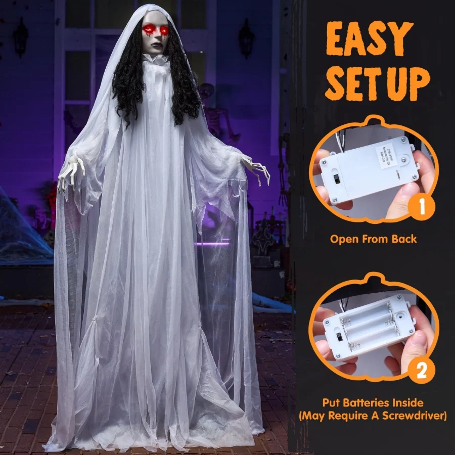 Premium Quality and Easy to Set Up: Crafted from durable materials, our Bride Ghost prop is built to last, ensuring it remains a standout piece in your Halloween decor for years to come. Plus, it’s easy to set up, so you can focus on creating the ultimate haunted experience without any hassle. 3 AAA batteries required (NOT INCLUDED)