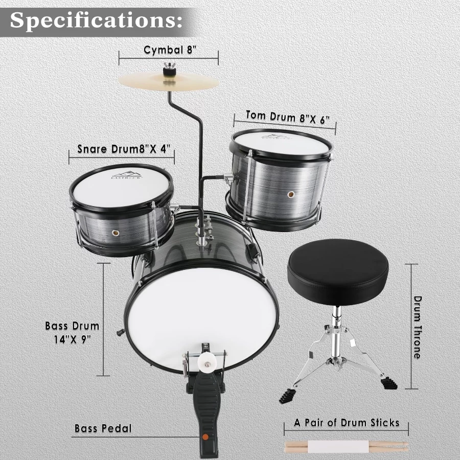 Specifications: Kids drum kit comes in various different configurations, typically consisting of a 14X9” bass drum, 8X4” snare drum, 8X6” tom, and a 8” crash cymbal. Also includes hardware – such as connecting bolt, pedals, drum stools, drum key and a pair of drumsticks.