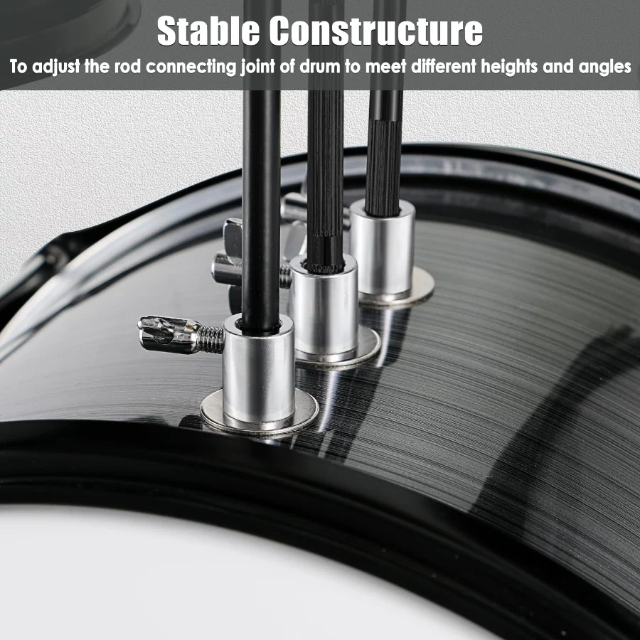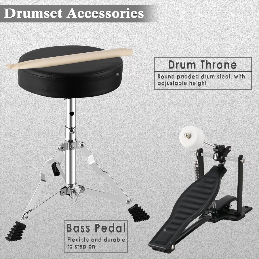 Real Wood Shells: This drum set features multi-ply poplar wood shells,drum heads with good resilience and sturdy chrome hardware that can produce rich, warm tones. The overall sturdy construction allows for long-term music practice.