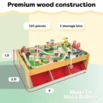 MADE OF WOOD: Premium, sustainable materials are used to craft this train table. Colorful illustrated graphics adorn the tabletop. It includes train cars but is also compatible with other major wooden train brands so kids can mix and match favorites.