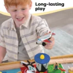 MULTIPLE PLAY AREAS: There’s a helicopter landing pad, an airport runway, a suspension bridge, waterfall tunnel, turnaround track and more—room for more than one kid to play.