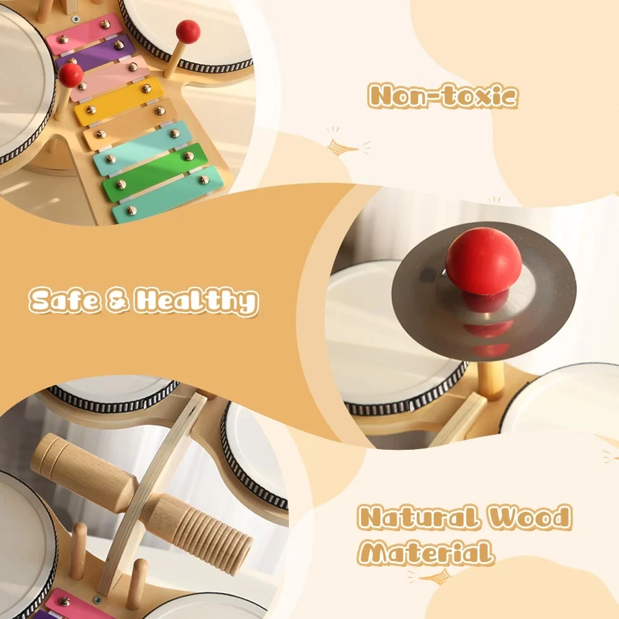 SAFE AND HIGH QUALITY MATERIALS: The KIDS Drum Set is CPC and CE certified. And it is made from high quality natural wood, which is free from paint and coatings.Each corner has adopted a rounded process and there will be no sharp or rough parts to hurt your baby’s hands.It is the perfect learning music toy for boy musicians and girl musicians, inspire your child’s musical talent by happily drumming and playing the xylophone.