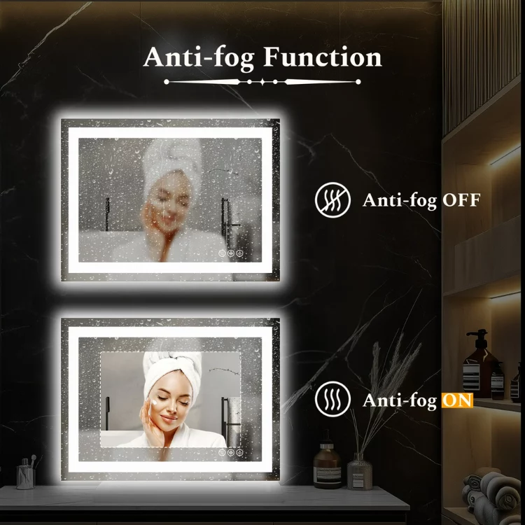 ANTI-FOG & IP54 WATERPROOF: this vanity mirror with lights has an expanded anti-fog pad on the back, that heats up to keep mirror fogless and clarity. One touch to defog helps make a perfect vanity mirror for makeup or shaving. IP54 waterproof ensures safe and durable lighting experience in humid bathroom environment.