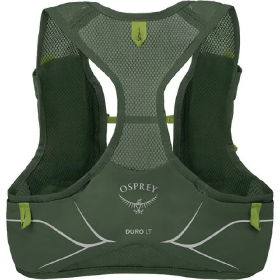 - Chase PRs, not slosh. The Osprey Duro LT keeps things fast and tidy: twin 360 ml soft flasks ride high for easy sips, while the airy stretch-mesh body hugs without hot spots. A dual-entry rear pocket swallows a wind shell or gloves, front drop-ins handle gels and phone, and removable dual sternum straps let you fine-tune the fit.
