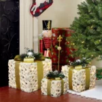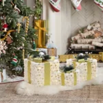 - Refined holiday aesthetic: Three soft white fabric gift boxes with intricate gold snowflake and tree motifs for a sophisticated seasonal look.