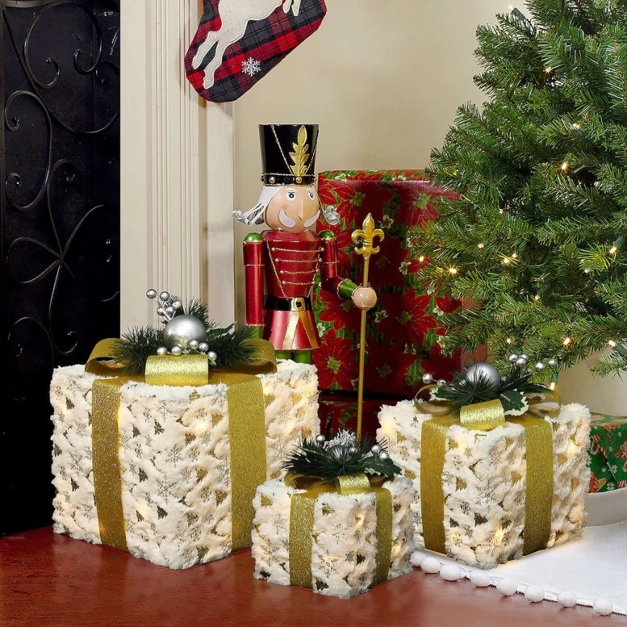 - Cozy illuminated glow: 45 integrated warm white LEDs softly light each box to enhance mantels, entrances, and under-tree displays.