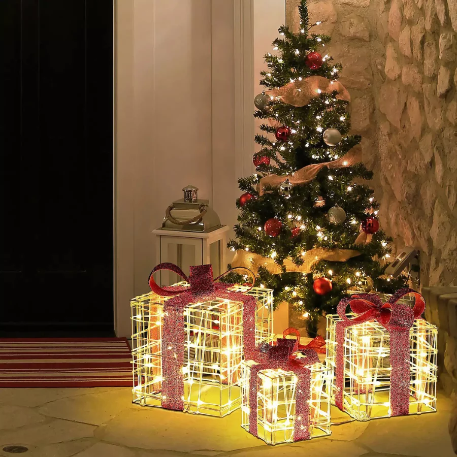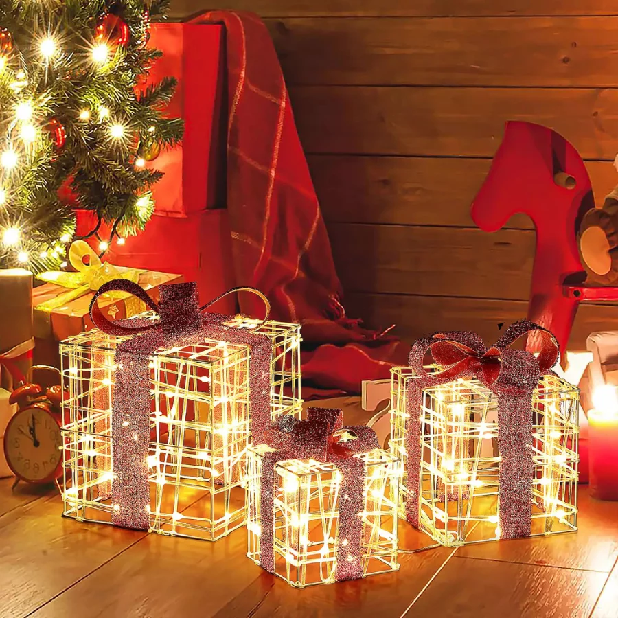• Festive 3-piece set: Three iron-wire gift boxes wrapped with transparent light wire, ribbons, and bows for a lively holiday centerpiece.