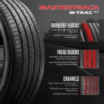 The Mastertrack M-TRAC GT Tire is an innovative, high performance tire. Its asymmetric tread design optimizes braking, cornering, and acceleration for a more responsive and controlled drive and the semi-closed shoulders reduce noise levels and increase stability, providing a quieter and more stable ride.