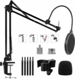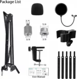 Complete Microphone Stand Kit: Package includes everything needed for studio recording or broadcasting, 1 x microphone arm stand, 1 x table clamp, 1 x mic holder/clip, 1 x pop filter, 1 x mic cap, 2 x metal screws(3/8″to 5/8″ and 3/8″ to 1/4″), 5 x cable ties, and 1 x Product Manual. The microphone arm can be folded for easy carrying and storage.
