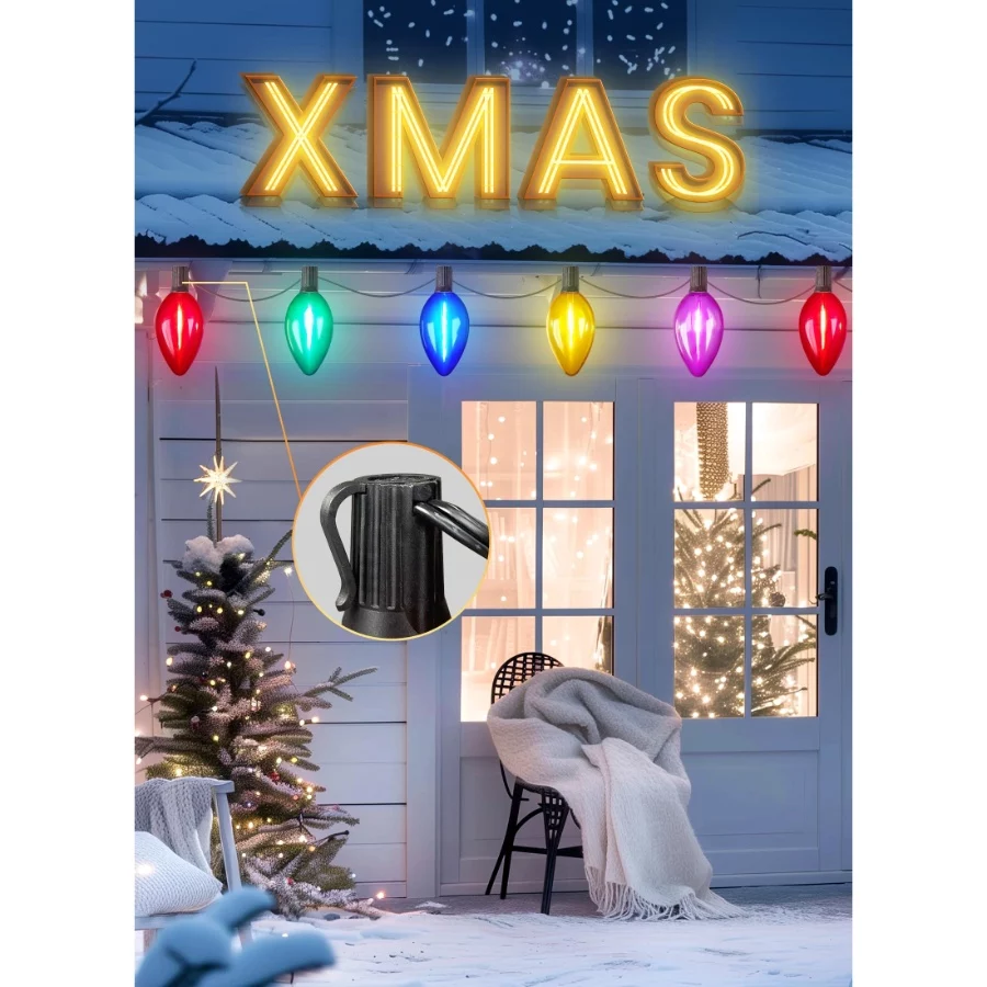Solar Double C9 Christmas Pathway Lights Outdoor: Double C9 bulbs covered Christmas string lights, bulb size: 2.6*5.8 nches, and each bulb is 1.5 feer apart, 7.7 inches pathway markers, 3FT lead cord, 13.5 FT lighting length,total 17 FT, outdoor indoor use. Bulit-in hooks, you also can hang these charming holiday lights on roof, window, fence, etc. Outdoor christmas lights will light up your pathway, garden, yard, house when they are on.