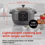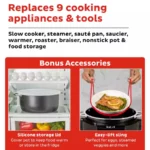 - Functions as a slow cooker, steamer, sauté pan, saucier, warmer, roaster, braiser, nonstick pot, and food storage