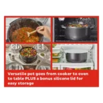 - Aluminum inner pot is over 80% lighter than ceramic for easier carry from cooker to oven (up to 350°) to table