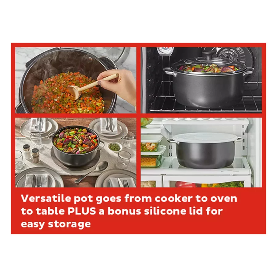 - Nonstick ceramic-coated aluminum cooking pot; dishwasher-safe glass lid and silicone accessories