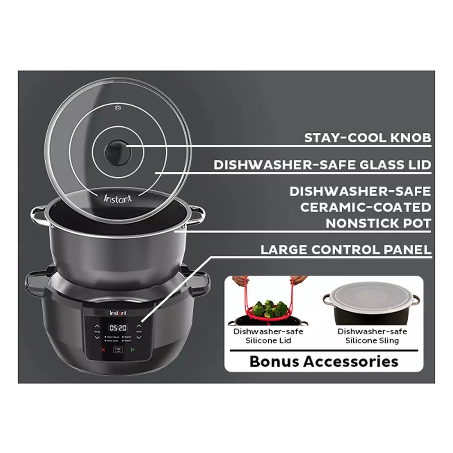 - Functions as a slow cooker, steamer, sauté pan, saucier, warmer, roaster, braiser, nonstick pot, and food storage