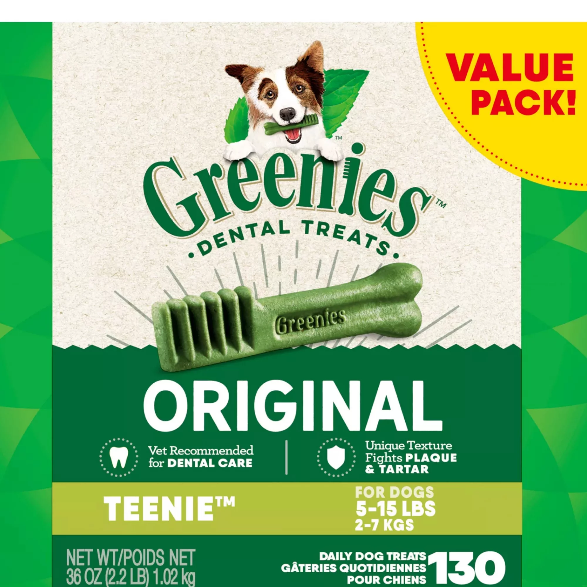 Includes one (1) 54 oz bag / 192-count Greenies Original TEENIE Dental Dog Treats