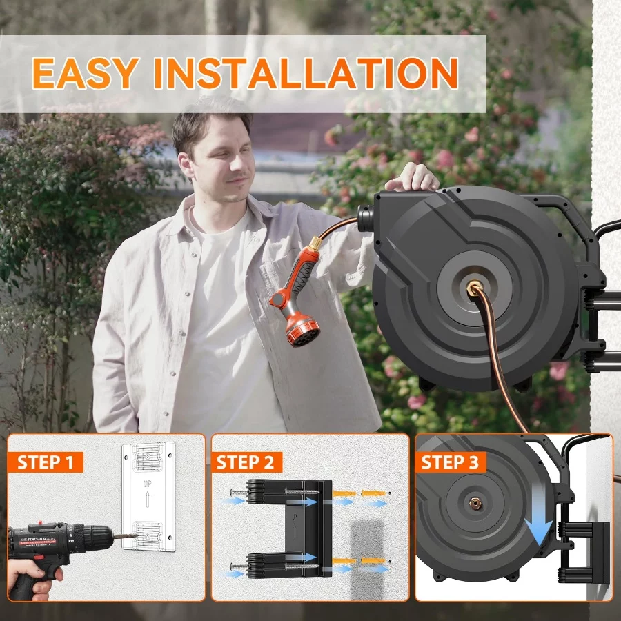Auto-Retracting System: Retractable garden hose reel with enhanced slow-speed rewind technology. Retractable water hose automatically coils with gentle pull force, cutting watering time by 75% compared to standard water hose reels for outside.