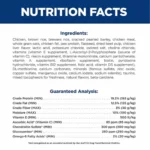Moisture (max) 10.0%; Protein (min) 19.3%; Fat (min) 12.5%; Crude Fiber (max) 3.0%; Ash (max) 8.3%; Vitamin C (min) 85 ppm; Vitamin E (min) 500 IU/kg; Total Omega-6 Fatty Acids (min) 2.0%; Glucosamine (min) 250 ppm; Chondroitin Sulfate (min) 300 ppm