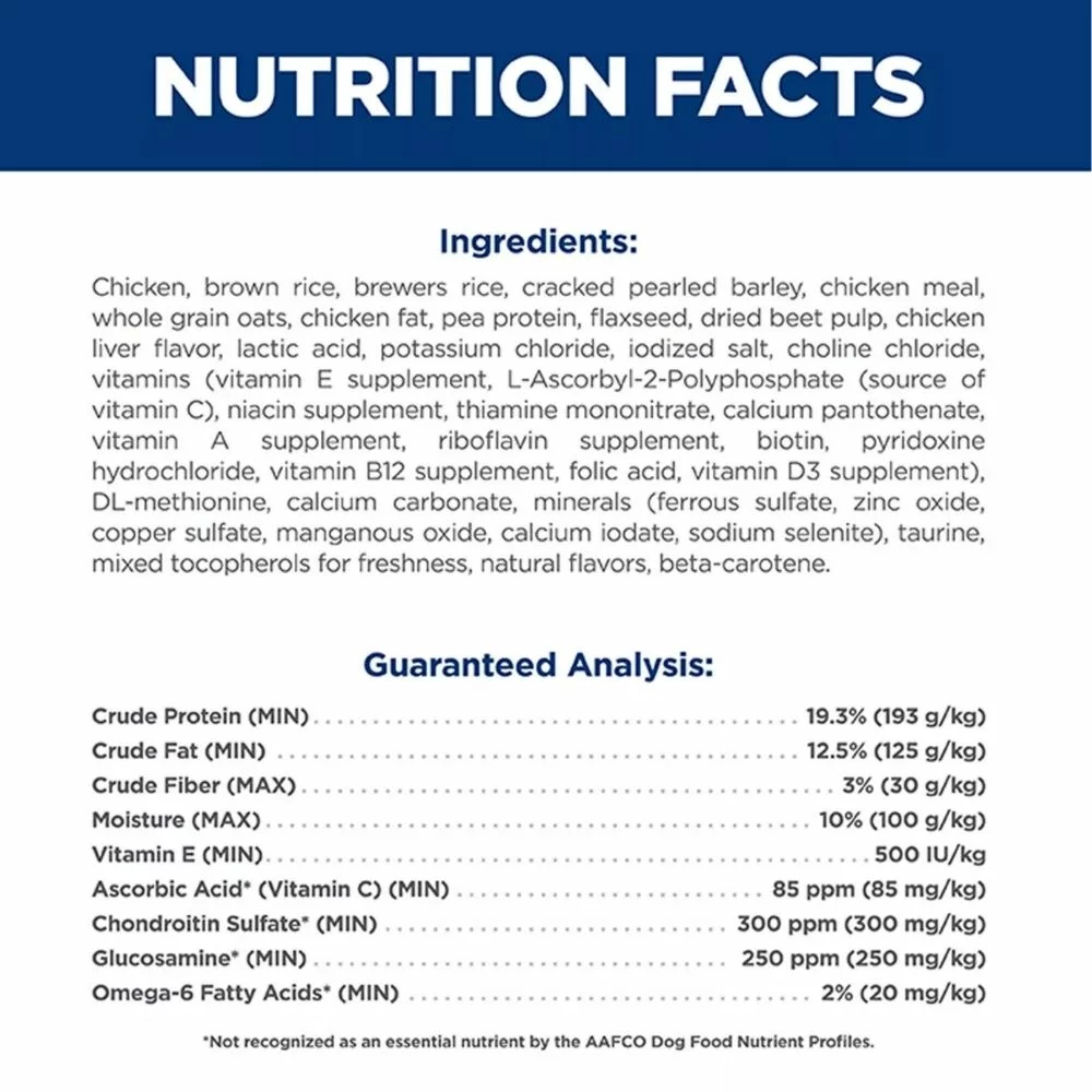 Chicken, brown rice, brewers rice, cracked pearled barley, chicken meal, whole grain oats, chicken fat, pea protein, flaxseed, dried beet pulp, chicken liver flavor, lactic acid, potassium chloride, iodized salt, choline chloride, vitamins (vitamin E supplement, L-ascorbyl-2-polyphosphate [vitamin C source], niacin supplement, thiamine mononitrate, calcium pantothenate, vitamin A supplement, riboflavin supplement, biotin, pyridoxine hydrochloride, vitamin B12 supplement, folic acid, vitamin D3 supplement), DL-methionine, calcium carbonate, minerals (ferrous sulfate, zinc oxide, copper sulfate, manganous oxide, calcium iodate, sodium selenite), taurine, mixed tocopherols for freshness, natural flavors, beta-carotene.