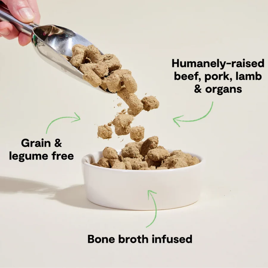 - Freeze-dried raw and bone broth coated kibble with added pork and beef freeze-dried raw chunks for enhanced flavor and nutrition.