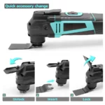 Quick Blade Change: The tool features a tool-free blade change mechanism—simply open the blade lock, insert the required accessory, and close the lock. No extra tools needed for fast switching between functions. Instantly transform it into a detail sander, cutter, scraper, or grinder, making it an essential multi tool kit for home or professional projects.