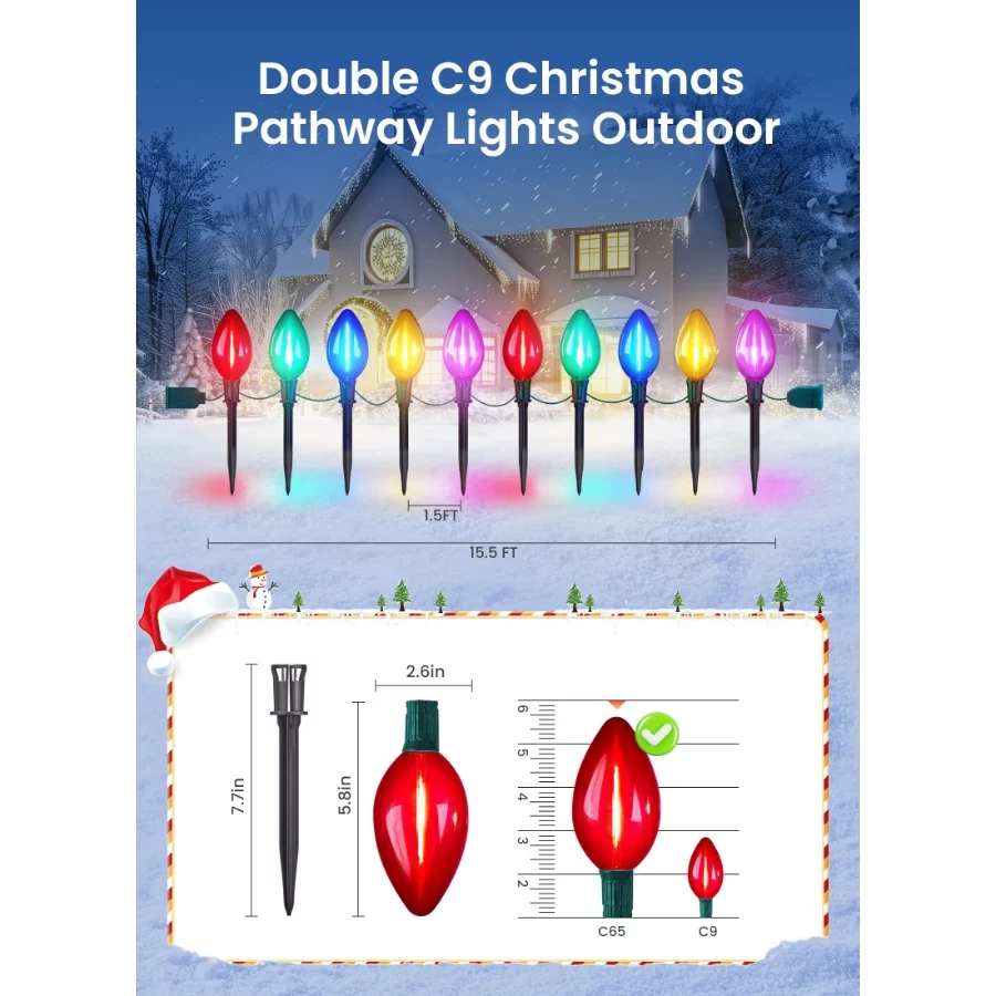 Double C9 Christmas Pathway Lights Outdoor: Elevate your outdoor décor with these Double C9 bulb-covered Christmas string lights. Each bulb measures 2.6 x 5.8 inches and is spaced 1.5 feet apart, serving as 7.7-inch pathway markers. Featuring a 1.5-foot lead cord, 13.5-foot lighting length, and a total length of 15.5 feet, these lights are suitable for both outdoor and indoor use, creating a truly festive atmosphere