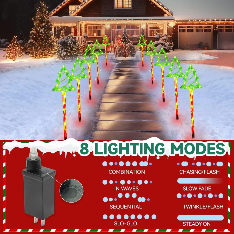 CHRISTMAS LIGHTS WITH 8 MODES – Our Christmas pathway lights are accompanied by 8 different lighting methods(Combination/In waves/Sequential/Slo-Glo/Chasing/Flash/Slow fade/Twinkle/Flash/Steady on) to meet your different needs. The flickering lights will elevate the appeal of your holiday display, create a cool Christmas light show for you.