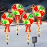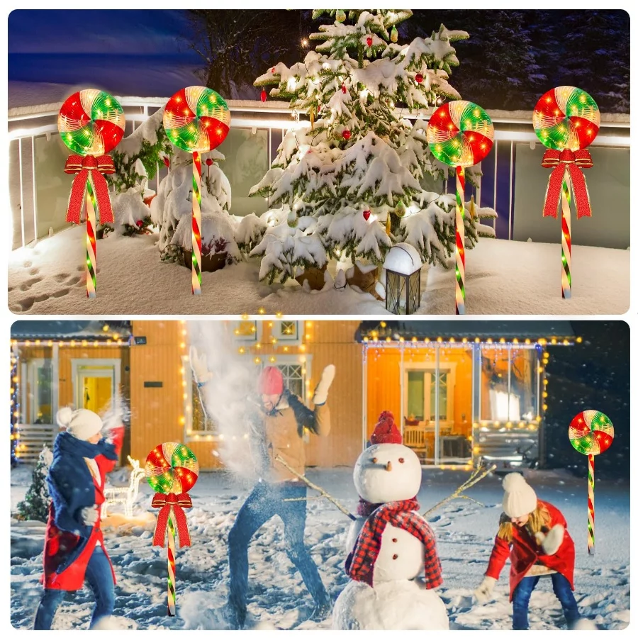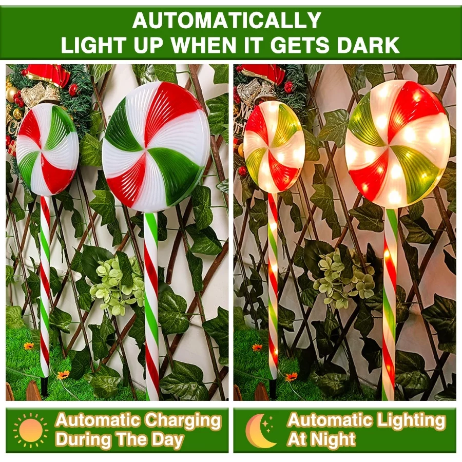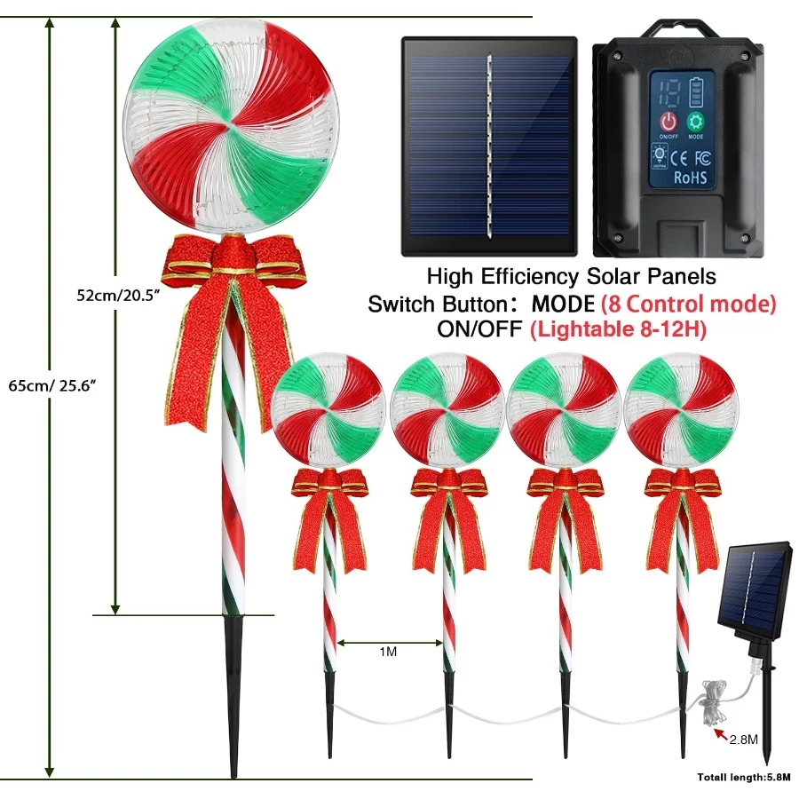 Large Size Candy Xmas Lights Long Distance with Christmas Bows:The Lollipop Peppermint Diameter is 7.2”,total height of the stake lights is 25.6”,large size Christmas lights.The string from solar panel to first stake is 110”, between each stake is 39.4 inch. Also comes with large size Christmas bows.The Christmas lights provide a long distance lighting and decoration