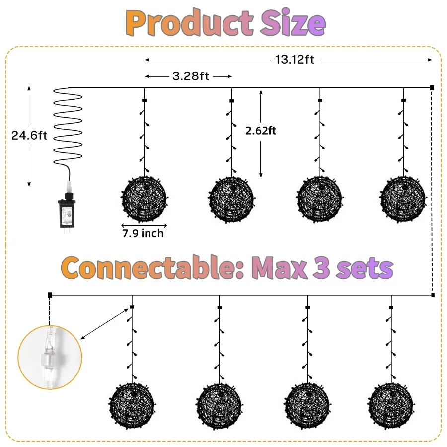 Christmas Outdoor Decorations Lights – A string of garden globe lights with 4 luminescent balls, each measuring 7.9 inches in diameter. Each ball features 46 LED bulbs, with a 2.62ft drop length for each ball and a 3.28ft gap between two balls, 24.6ft extension cord. TuoPuLife sphere lights will make your house shine the brightest on street.