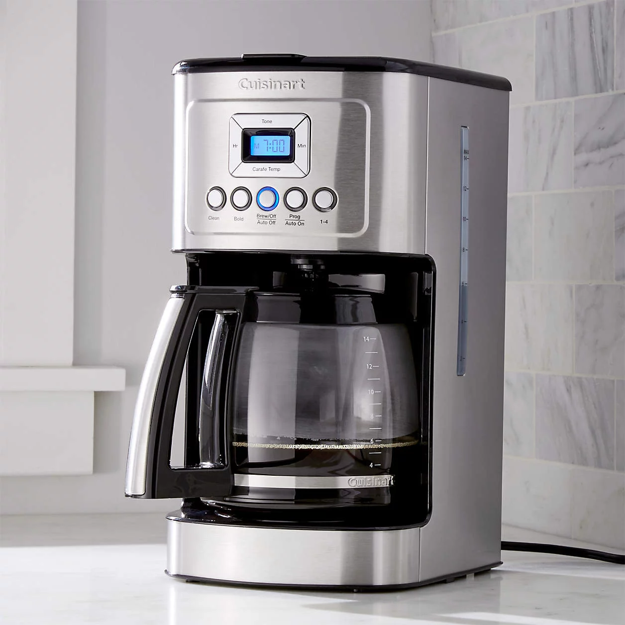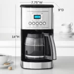 This 14-cup programmable drip coffee with timer maker provides hotter coffee without sacrificing taste. Strength control brews regular or bold with a brew-pause function that lets you enjoy a cup before the brewing cycle has finished. Gold-tone coffee filter means no paper filters and easy cleanup. Sixty second reset recalls your setting in case of a power outage.