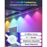 RGB+IC+CW Colors – This smart outdoor light fixture uses RGB+IC+CW technology, which offers 16 million colors. You can adjust the light’s color, effects, speed, and brightness however you like. The color temperature can be adjusted from warm white to cool white (2700K to 6500K). The permanent Christmas outdoor lights have an anti-glare lens that makes it bright but not too bright, like a soft and vibrant halo.