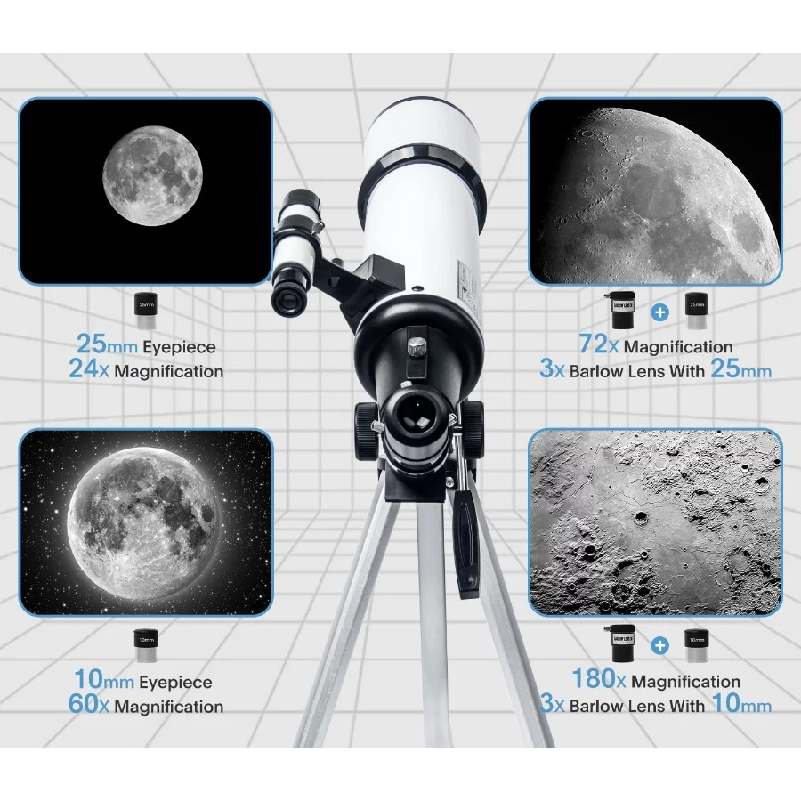 Optimum Magnification: Our telescope for kids and adults is quipped with two replaceable excellent-quality eyepieces (25mm and 10mm) for 24X and 60X magnification. 3x Barlow lens trebles the magnifying power of each eyepiece. magnificate moon up to 72 or 180 times. Also with 5×24 finder scope makes locating objects easy.