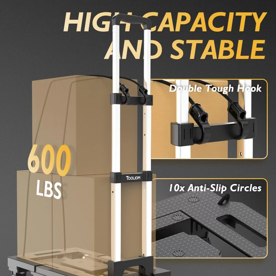 Folding Hand Truck: Can hold up to 600 lbs. The hand truck base measures 19.69″ x 13″, and the length is extendable. Broaden base plate with non-slip pad on it enables to hold large-sized stuffs more stably when transporting. When folded up, can be stored in car trunk or closet.