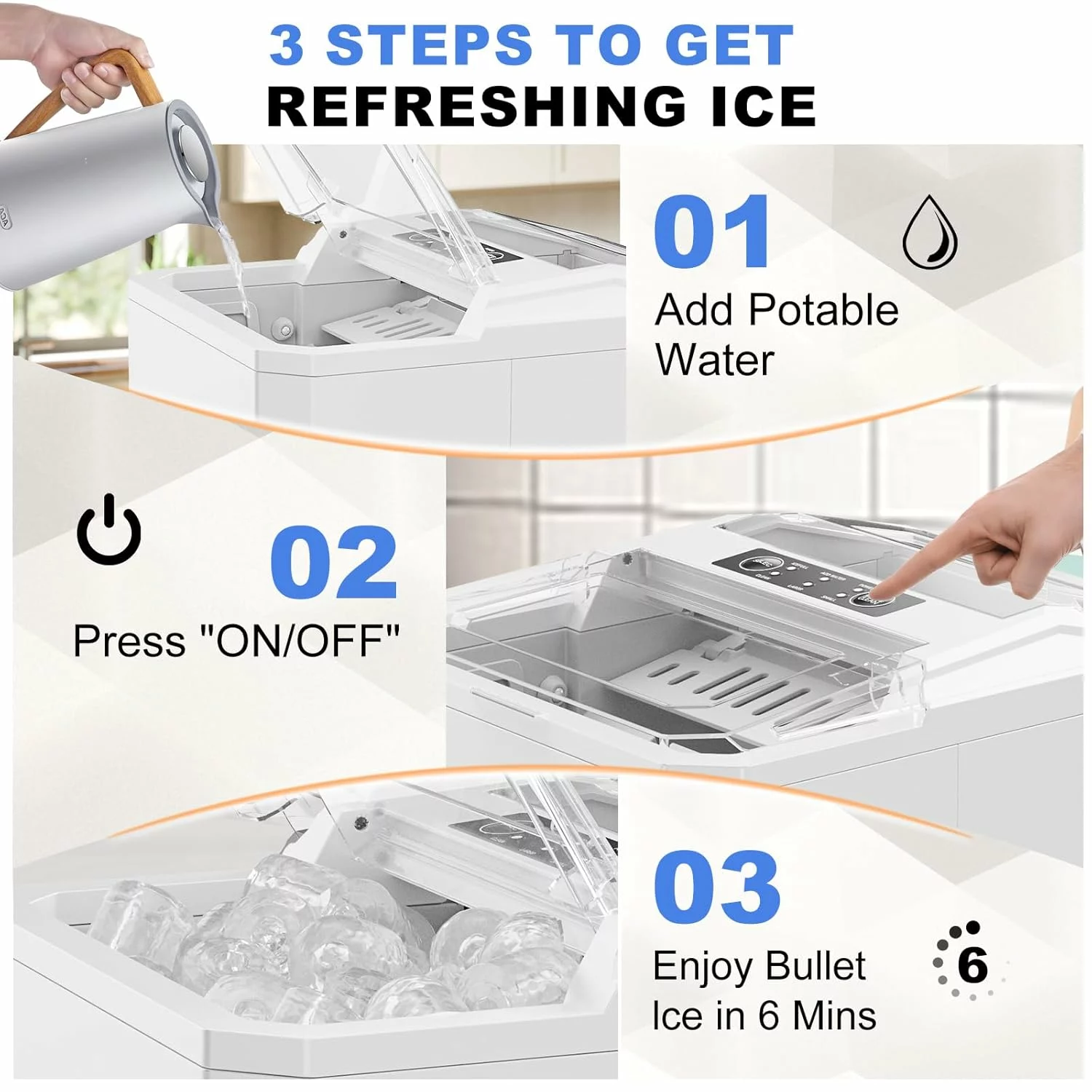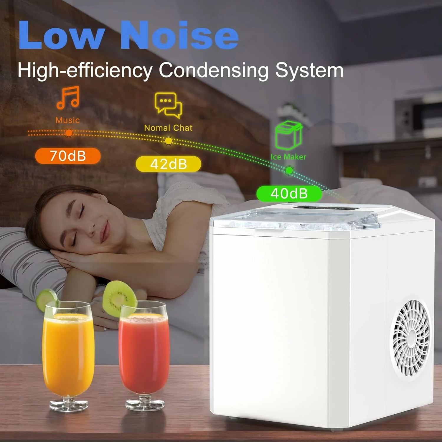 6 Mins Ice-Making 9 bullet ice cubes can be made in just 6 minutes. Equipped with a 1.5-liter tank and powerful compressor, the ice makers countertop can easily produce up to 26.5 pounds of ice per day. This quick ice making feature ensures that you are always ready for a party or spontaneous celebration.In refrigeration, but also at less than 40db normal noise, ensuring a comfortable and quiet environment to enjoy ice-making.