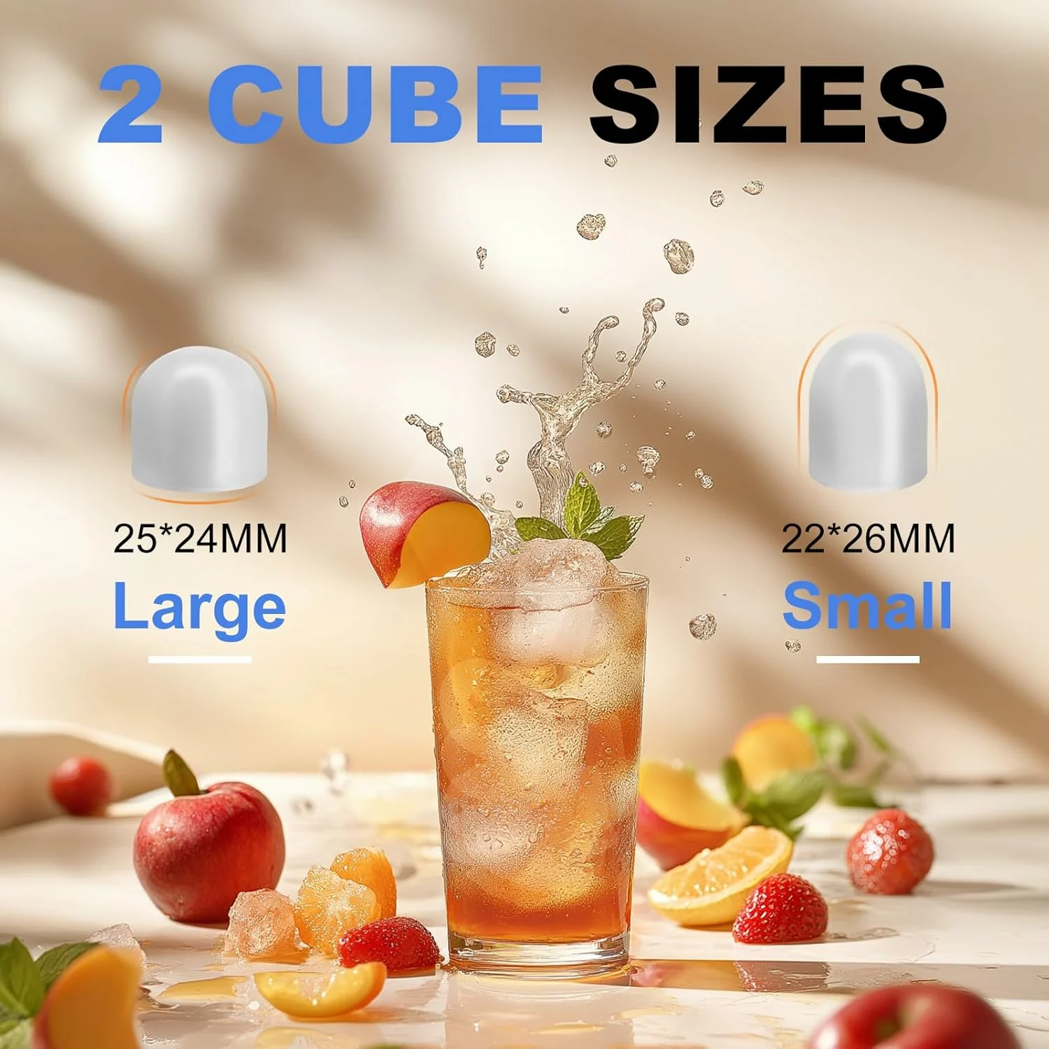 Two Sizes of Ice Cube You can make two different sizes of ice cubes with this counter top ice machine maker. Small ice cubes are great for keeping seafood or beer fresh and cool for a long time. Large cubes are better for making iced coffee or cold drinks for a quick cooling effect. Smooth bullet ice that won’t hurt your hands or mouth during use.