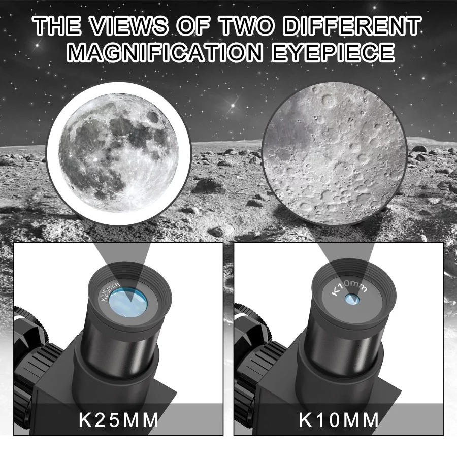 Powerful Magnification for Endless Discovery – Comes with two premium Kellner eyepieces (K25mm & K10mm) for versatile magnification from 51X to 128X. The 5×24 finderscope helps you locate objects quickly and easily, making it a breeze for kids and beginners to start their observing journey without frustration.
