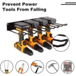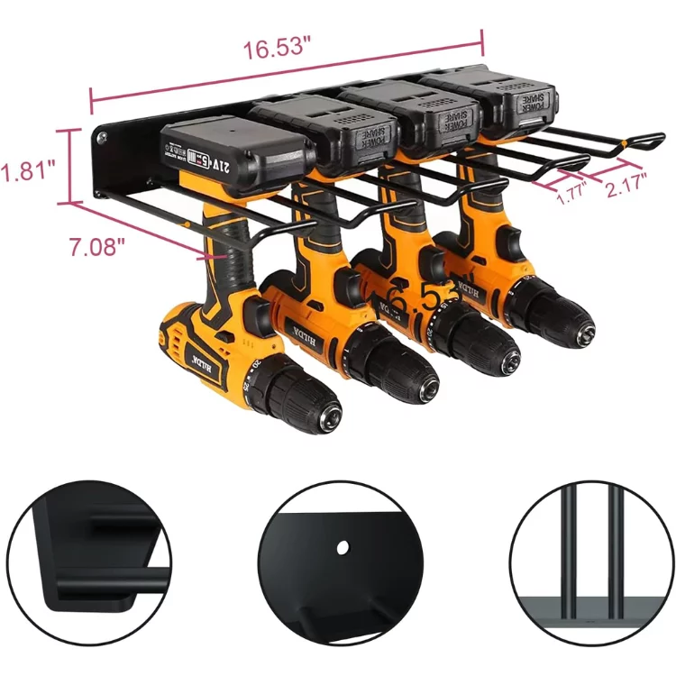 Durable & Strong Material Compared to most other power tool organizers, our drill rack wall mount has denser holes distance to prevent items from dropping. Curved hooks is prevent drop design, compare with the flat one, it’s safer for large drill. After checking the market normal quality, we decide use thicker plate and bold hook, it make our cordless drill storage rack won’t deformed even hold very heavy tools