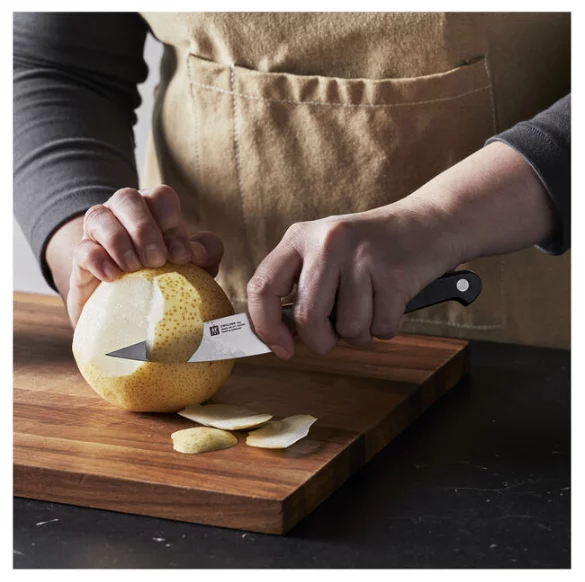 Bringing to bear 280 years of experience making and studying knives, Zwilling J.A. Henckels has created the most user-friendly knives on the market in its Pro series. Small, light and versatile, the paring knife has a slim blade and center tip to peel, cut, clean and create garnishes of fruit and vegetables. It can also be used to trim meat and larding. Forged from a single piece of steel the knife is hand sharpened and polished, and perfectly sized and weighted for all kinds of cutting tasks.
