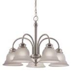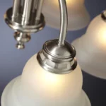 This chandelier from the Fallsbrook Collection features a rich Dark Brushed Nickel finish, paired with frosted glass shades for a soft, inviting glow.