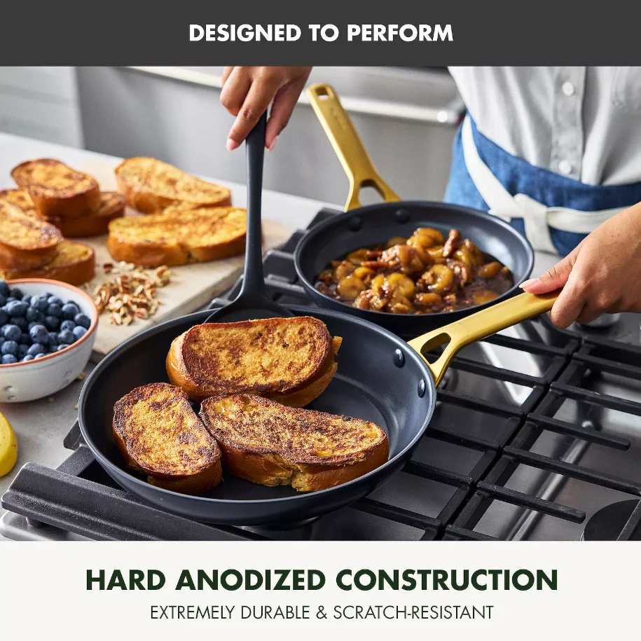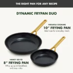 - Eye-catching frypan set with 10″ and 12″ sizes