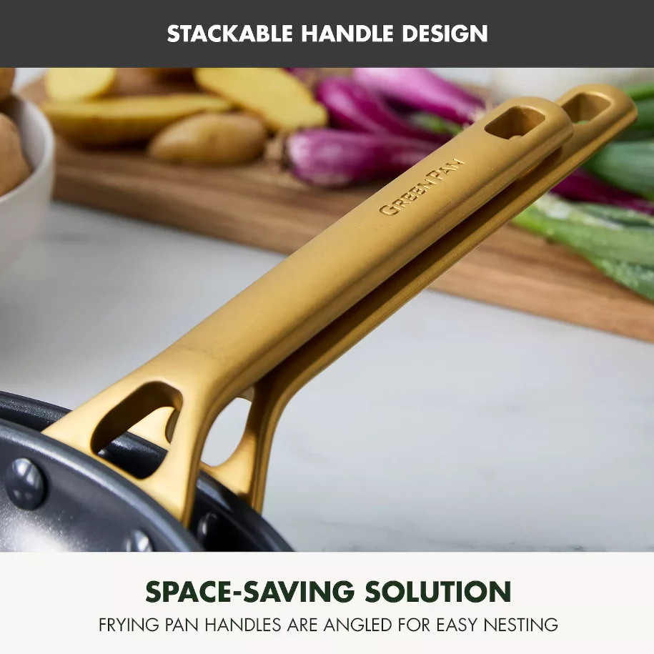 Cook up a storm with this stylish frypan set that has your back for everything from daily breakfasts to family feasts. Featuring a delightful 10-inch pan for everyday meals and a generous 12-inch pan for those impressive dinner parties, these GreenPan wonders combine modern design with top-notch nonstick performance, ensuring your cooking experience is both fun and fuss-free.