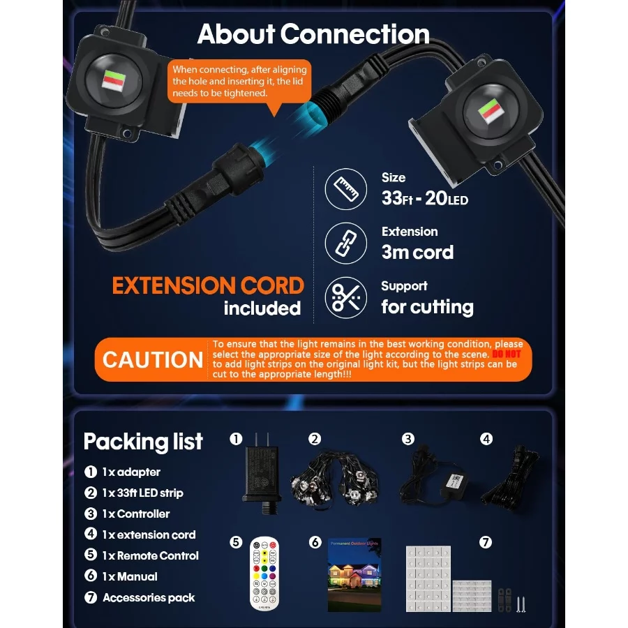 Indoor and outdoor use: The LED beads with an extended wall hook design offer more installation options. Supported by IP67 waterproof material, this smart string light can be installed as a permanent outdoor light on the eaves outside the house, or as a wall light on the ceilings and walls of the living room and bedrooms inside the house.