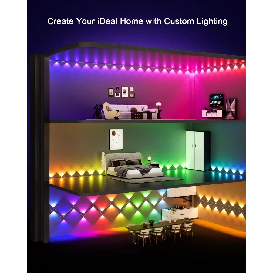 RGB IC lighting effect: The smart wall lights adopts advanced RGB IC led beads. The color and brightness of each light can be controlled individually, allowing for free DIY. It also achieves dynamic light chasing effects that RGB does not have, allowing you to fully explore the rainbow flowing colors. The unique 120° lens Angle design enables the LED light to present a larger wide-angle lighting effect, projecting a charming wavy light pattern.