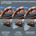 - Electronic steam regulation ensures leak-free ironing—no drips, stains, or color transfer